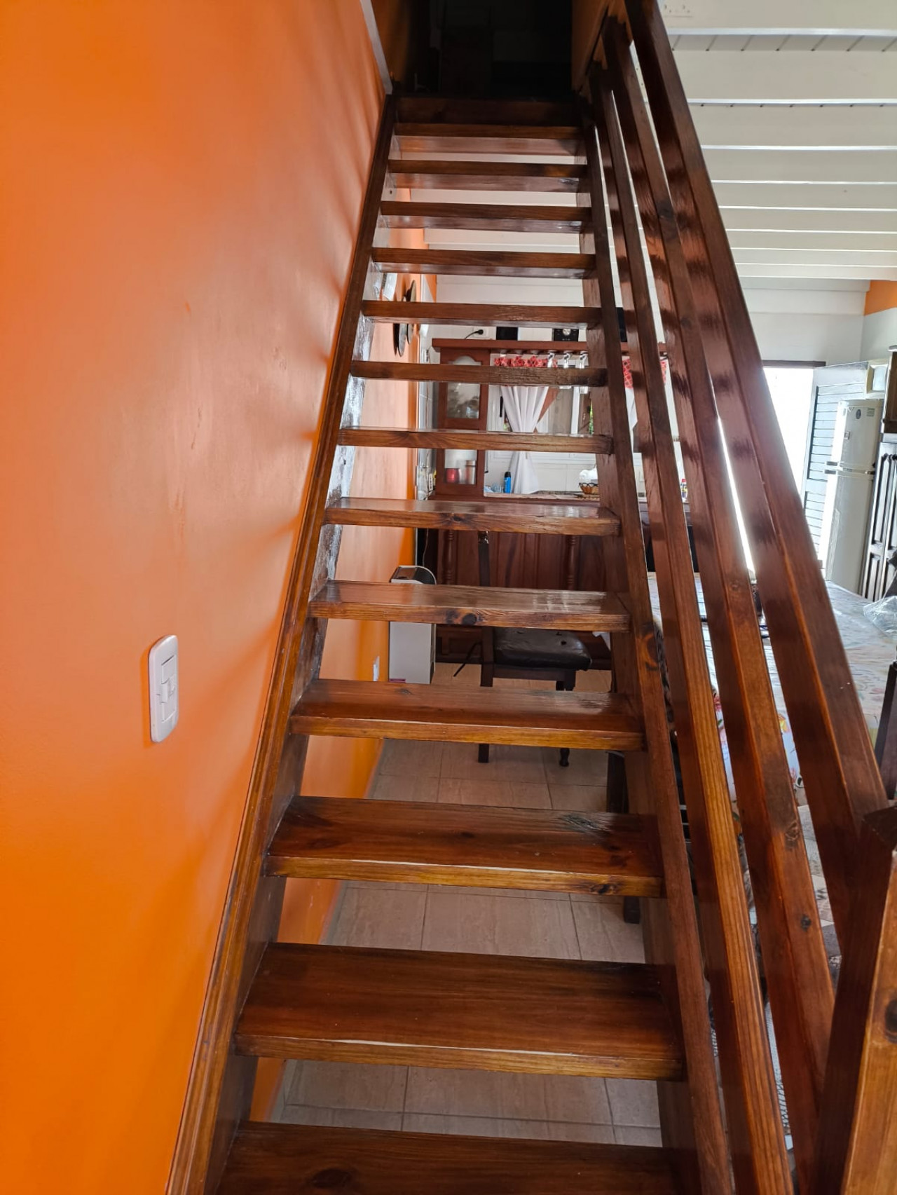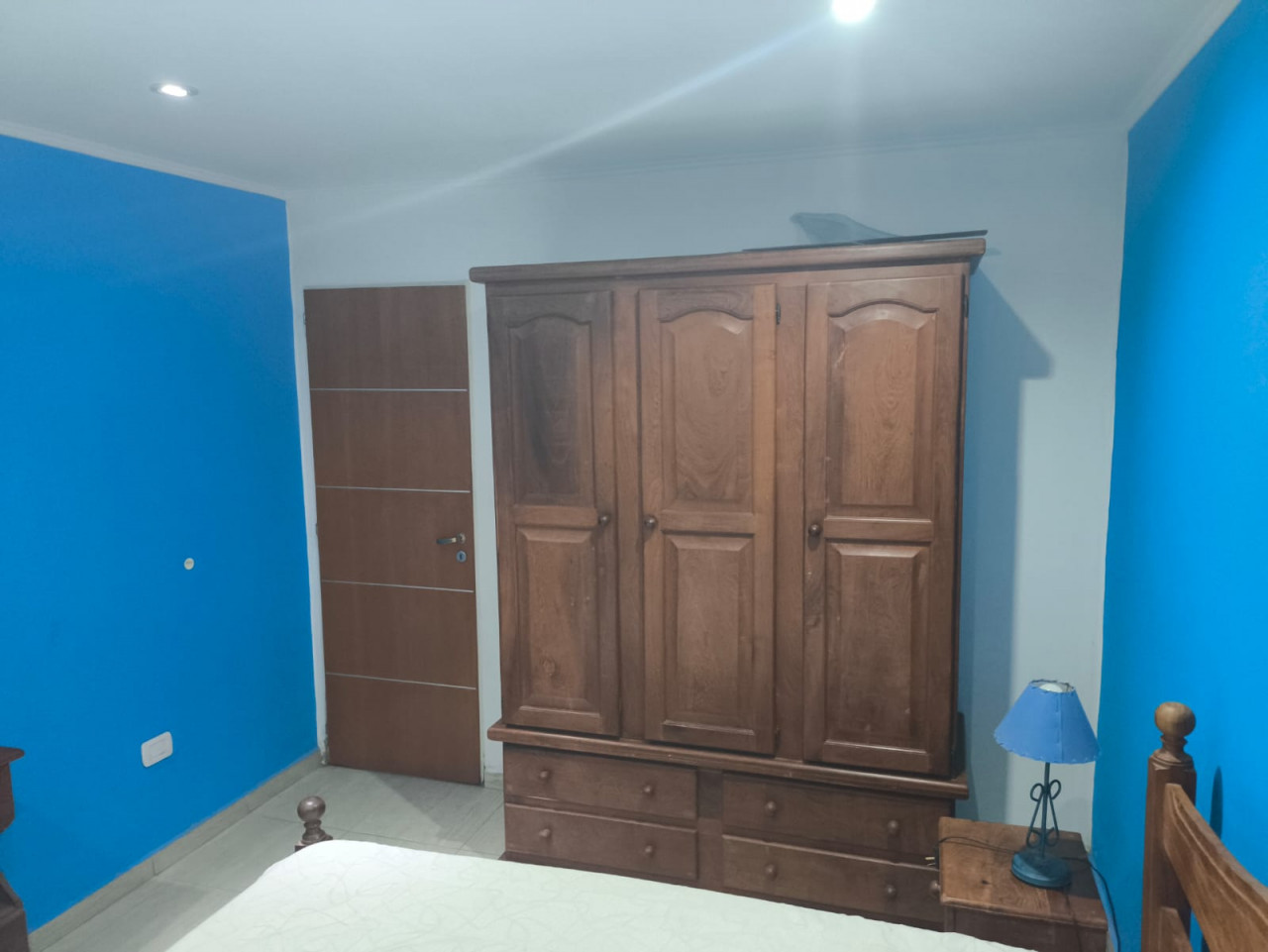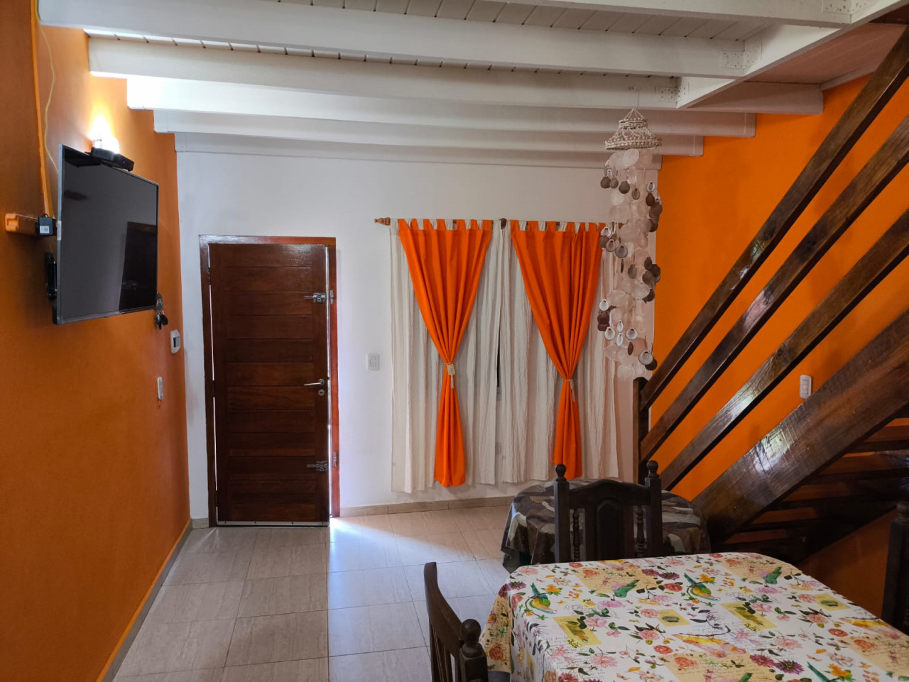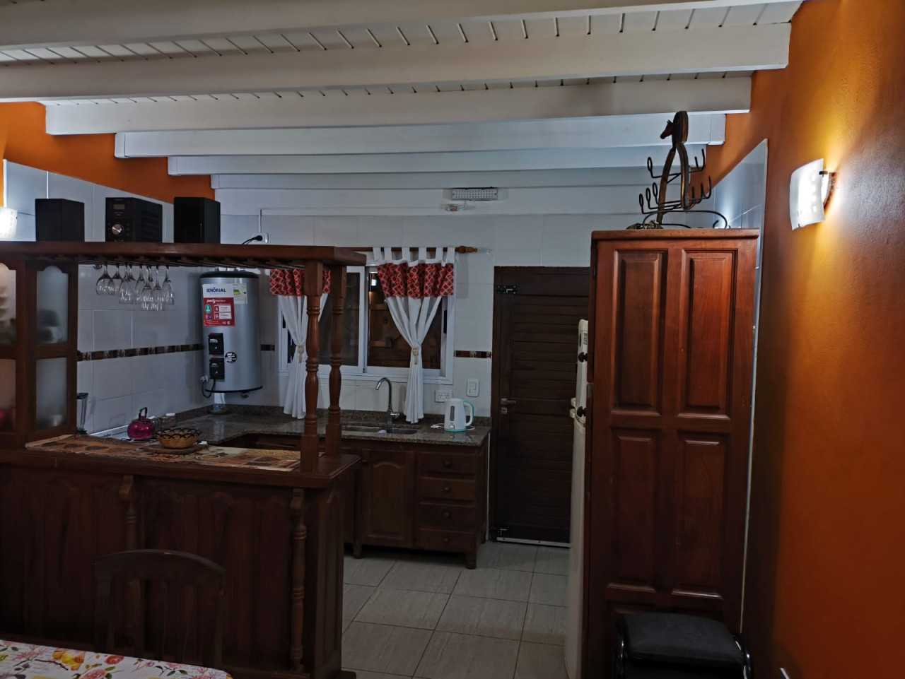 Casa: porche, living comedor y cocina integrados. Sector cocina: mesada de granito, doble bacha de acero inoxidable, muebles bajo mesada de algarrobo, barra desayunadora con copero, mueble vajillero, termotanque eléctrico, heladera con freezer, calefactor, mesa comedor de algarrobo con 7 sillas y aparato de TV. Hall de distribución a dos dormitorios; primer dormitorio: cama de dos plazas, dos mesas de luz, cómoda, ropero de 3 puertas y 4 cajones; segundo dormitorio: cama de una plaza, cama cucheta doble, mesa de luz, velador, ropero ídem y ventana. Baño: vanitory con puerta y cajones, espejo con luces, ducha y ventana. Puerta que comunica con el patio posterior al sector lavadero, con mesada, bacha y mueble bajo mesada ídem. Escalera que conecta con la planta alta.