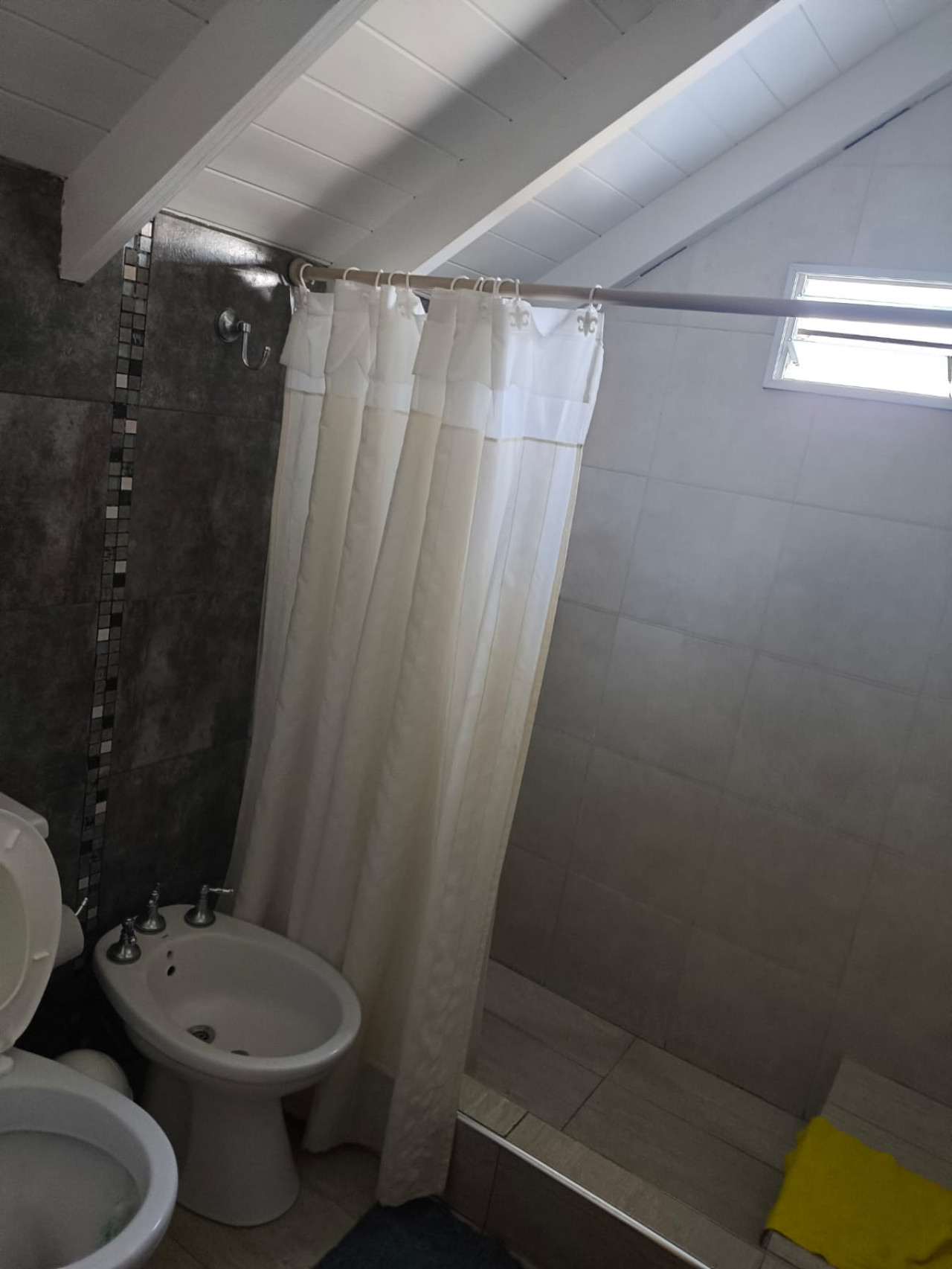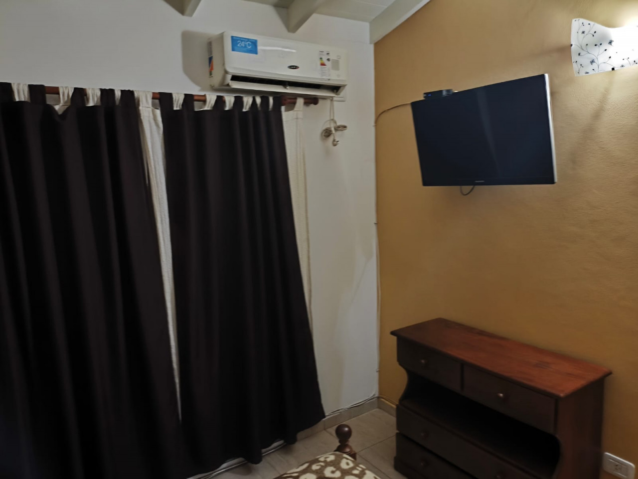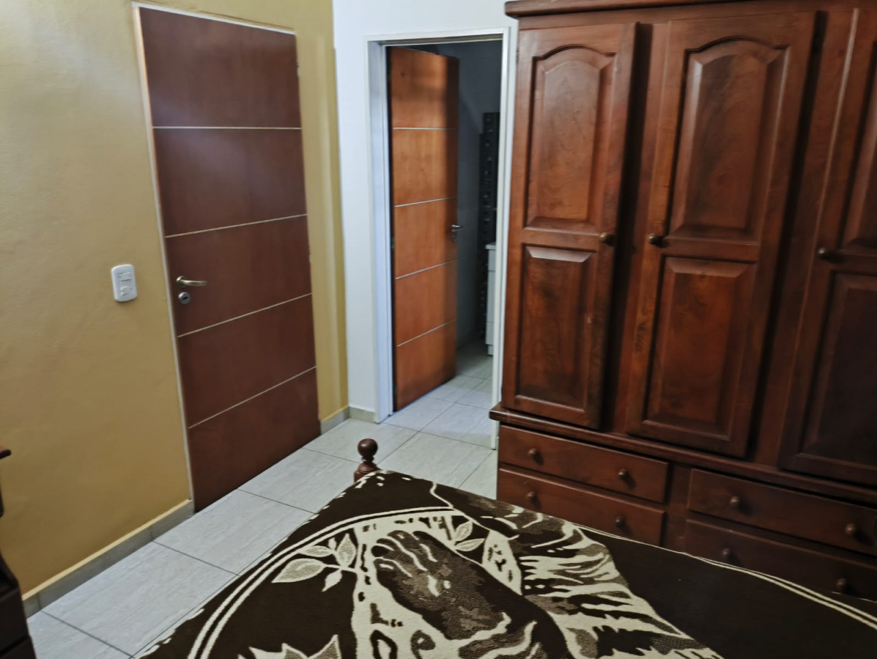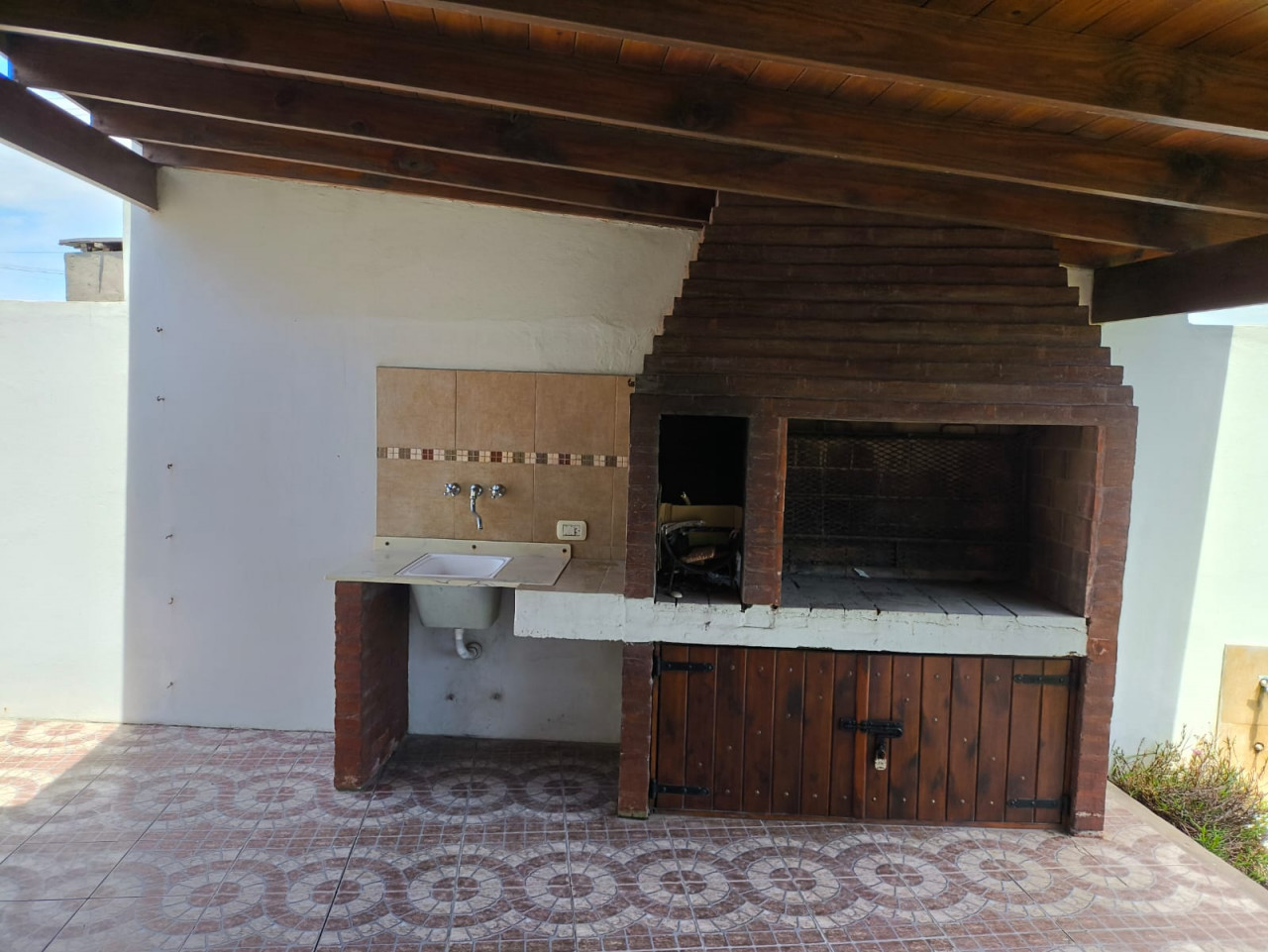 Casa: porche, living comedor y cocina integrados. Sector cocina: mesada de granito, doble bacha de acero inoxidable, muebles bajo mesada de algarrobo, barra desayunadora con copero, mueble vajillero, termotanque eléctrico, heladera con freezer, calefactor, mesa comedor de algarrobo con 7 sillas y aparato de TV. Hall de distribución a dos dormitorios; primer dormitorio: cama de dos plazas, dos mesas de luz, cómoda, ropero de 3 puertas y 4 cajones; segundo dormitorio: cama de una plaza, cama cucheta doble, mesa de luz, velador, ropero ídem y ventana. Baño: vanitory con puerta y cajones, espejo con luces, ducha y ventana. Puerta que comunica con el patio posterior al sector lavadero, con mesada, bacha y mueble bajo mesada ídem. Escalera que conecta con la planta alta.