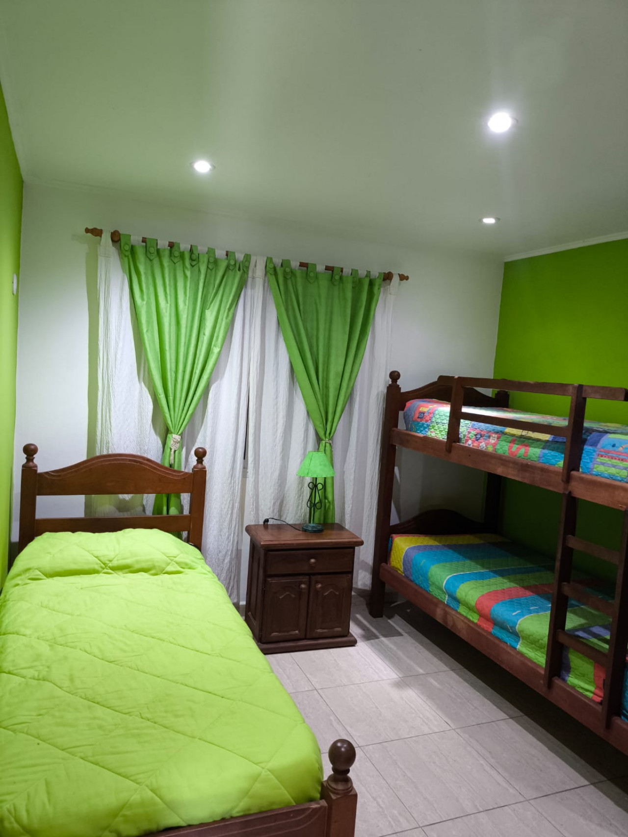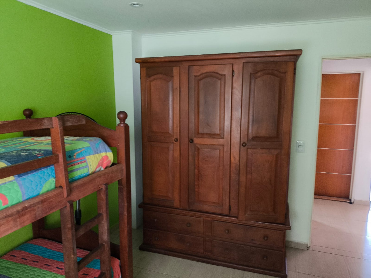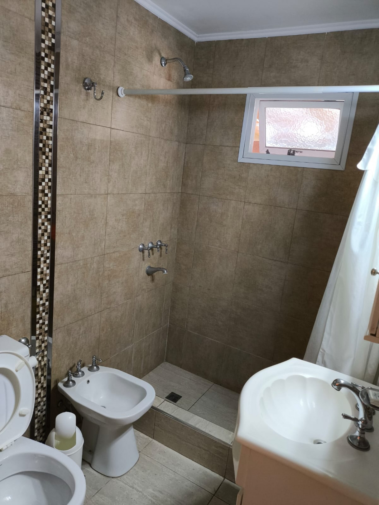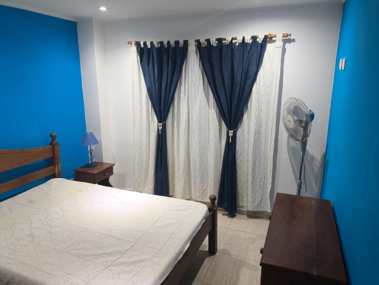 Casa: porche, living comedor y cocina integrados. Sector cocina: mesada de granito, doble bacha de acero inoxidable, muebles bajo mesada de algarrobo, barra desayunadora con copero, mueble vajillero, termotanque eléctrico, heladera con freezer, calefactor, mesa comedor de algarrobo con 7 sillas y aparato de TV. Hall de distribución a dos dormitorios; primer dormitorio: cama de dos plazas, dos mesas de luz, cómoda, ropero de 3 puertas y 4 cajones; segundo dormitorio: cama de una plaza, cama cucheta doble, mesa de luz, velador, ropero ídem y ventana. Baño: vanitory con puerta y cajones, espejo con luces, ducha y ventana. Puerta que comunica con el patio posterior al sector lavadero, con mesada, bacha y mueble bajo mesada ídem. Escalera que conecta con la planta alta.
