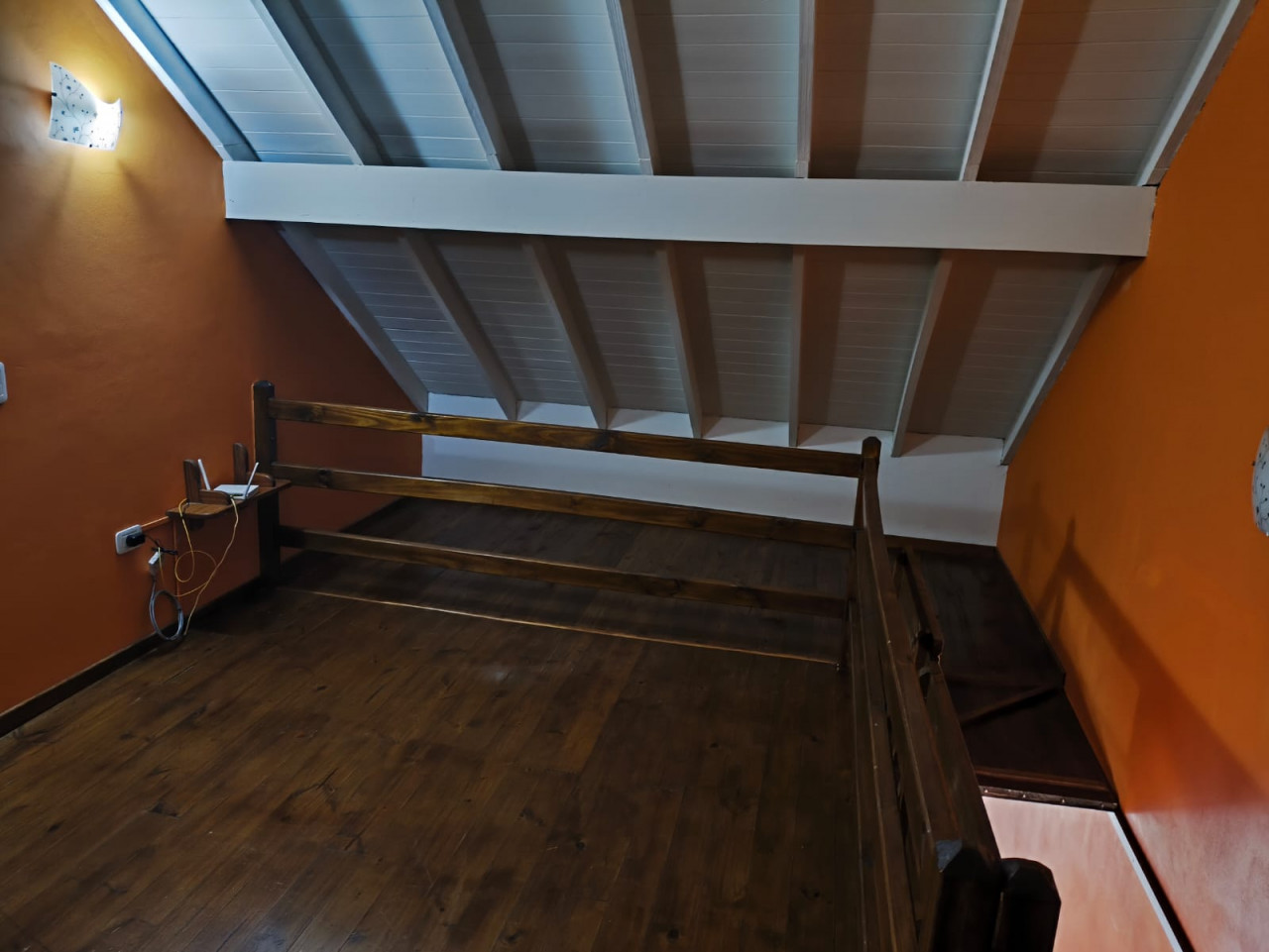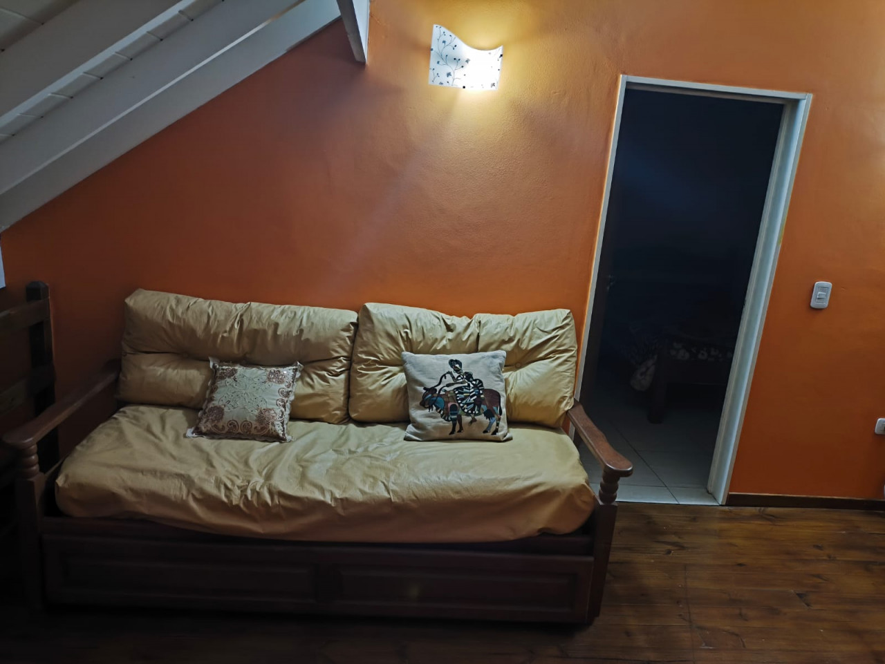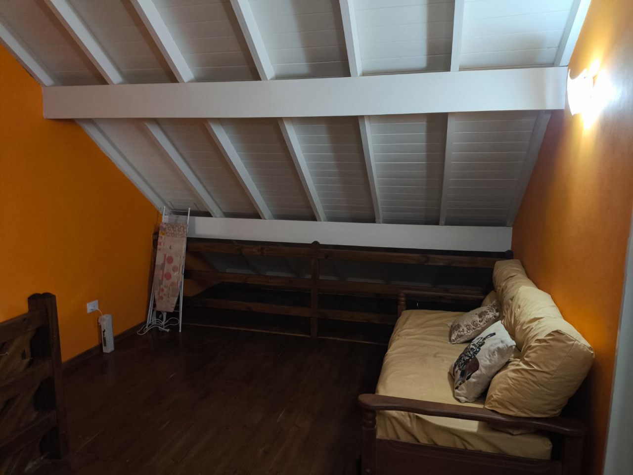 Planta alta: Playroom: sofá cama y aparato de TV, baranda de madera que balconea a planta baja; Suite: cama de 2 plazas con sus mesas de luz y veladores, cómoda, ropero ídem, aparato de TV, puerta balcón con postigones a balcón, baño compartimentado: antebaño con vanitory, baño con sanitarios, ducha y ventana, todo esto con cielorraso de madera a la vista pintado de blanco.