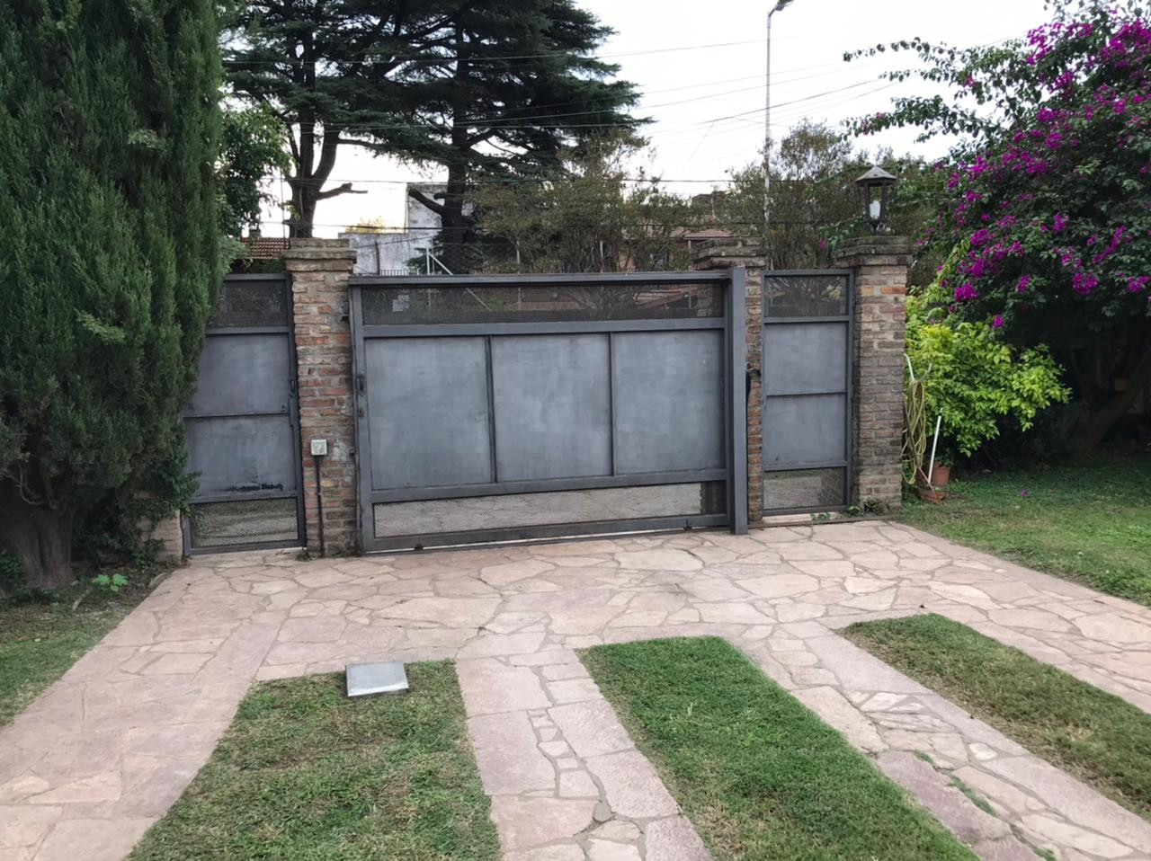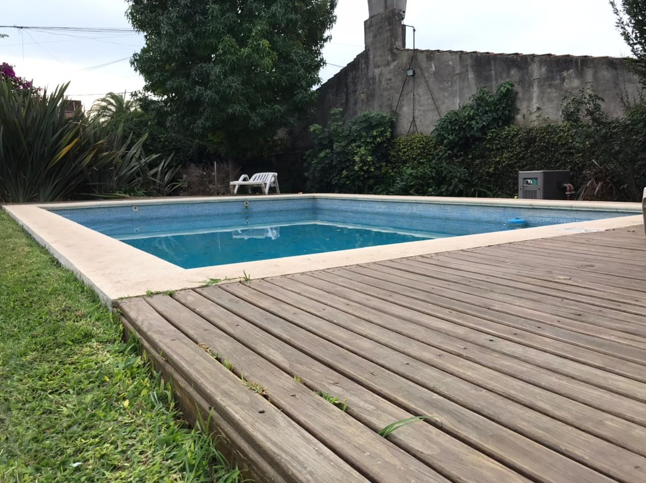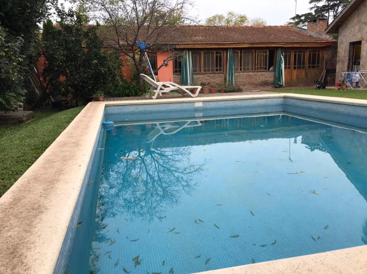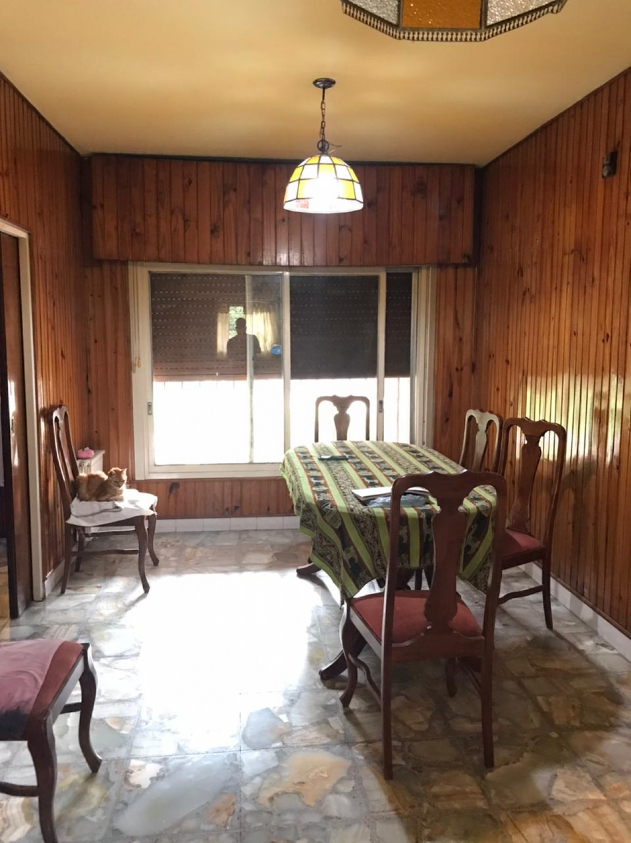 Puerta de madera de dos hojas corredizas, embutida, a cocina comedor diario con ventanal al frente, cocina con mueble bajo mesada, doble bacha de acero inoxidable, mesada de granito, bajo y sobre mesada, ventana, nicho para heladera, aire acondicionado tipo Split; todo este sector revestido de madera, 3º habitación con placar, acceso al altillo donde se encuentra instalada la caldera para la calefacción, ventana hacia el patio posterior. Hall a toilette completo, y puerta hacia el garaje. Puerta plegadiza al lavadero cómodo, con ventanas, placard y baulera, termotanque. Salida al jardín. Patio de medida generosas para tendedero. Jardín con gran variedad de arboles añosos, piscina climatizada con bordes de piedra atérmica y solárium en deck, revestida en venecita, con filtro y equipo de climatización; baño exterior nuevo: ante bañó con mesada de mármol travertino, doble bacha, sanitarios y ducha. Quincho enorme cerrado de 15 metros de largo x 5 metros de ancho con parrilla, horno a leña, cielorraso de madera a la vista, cuarto de guardado.