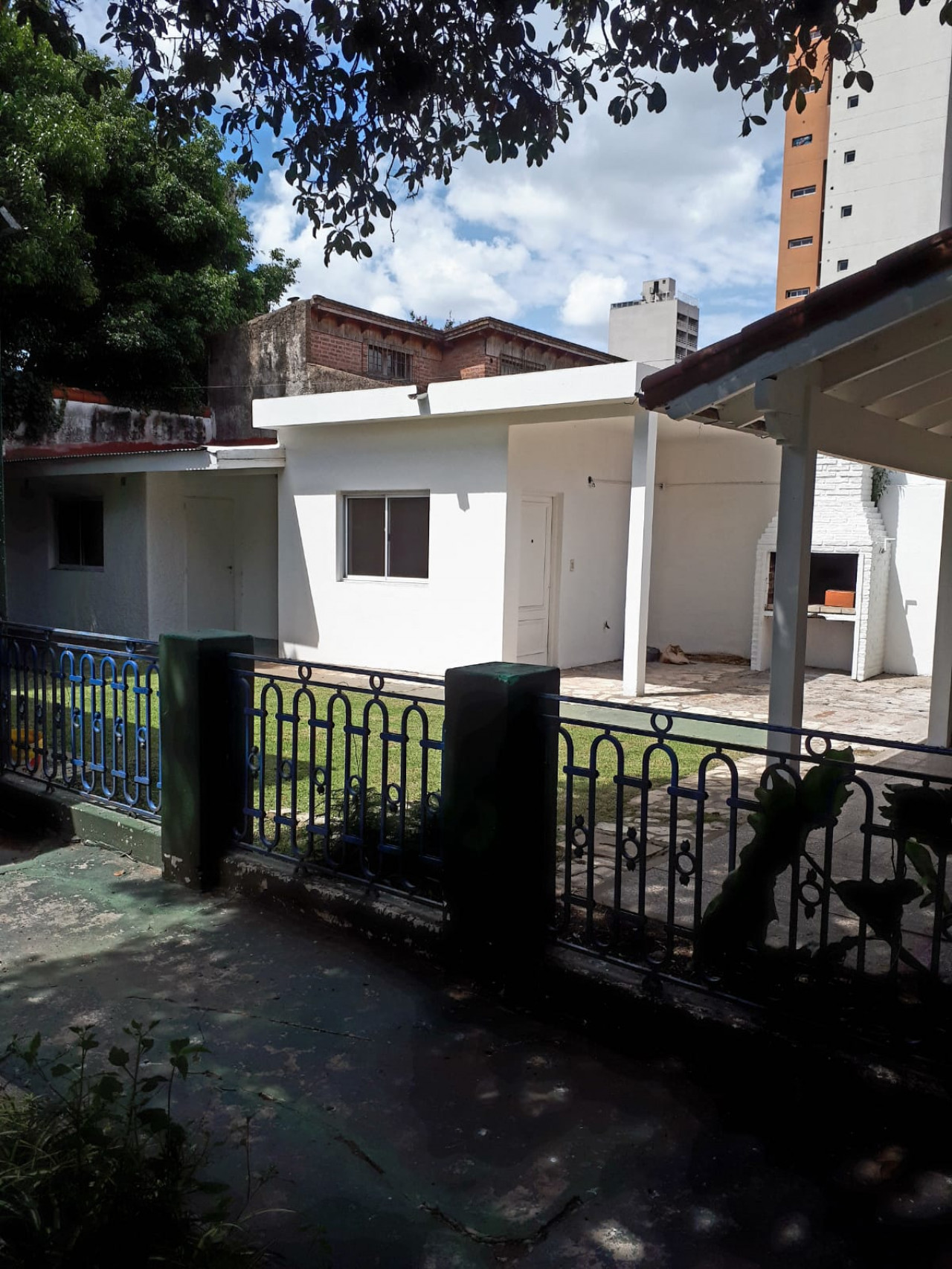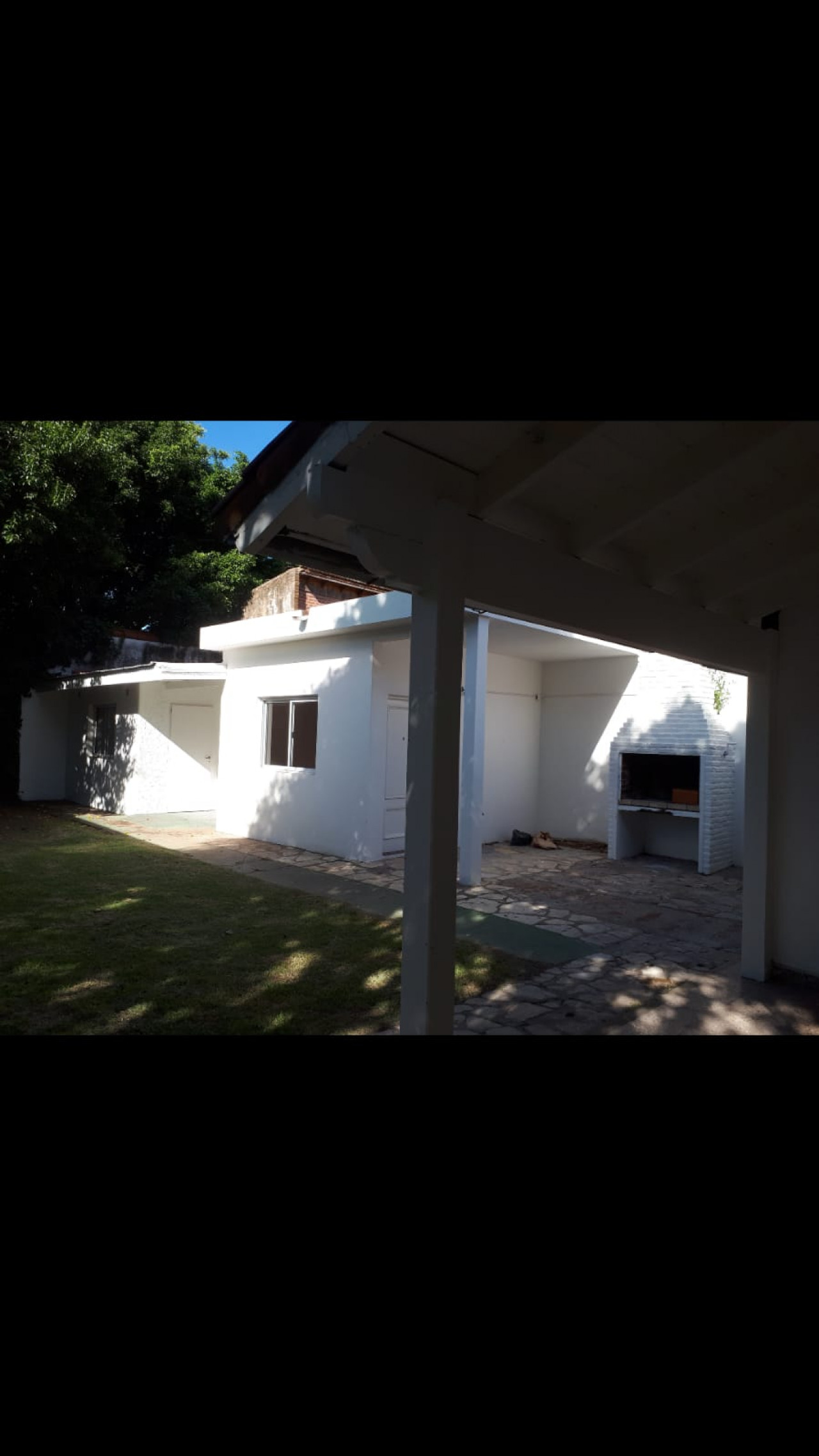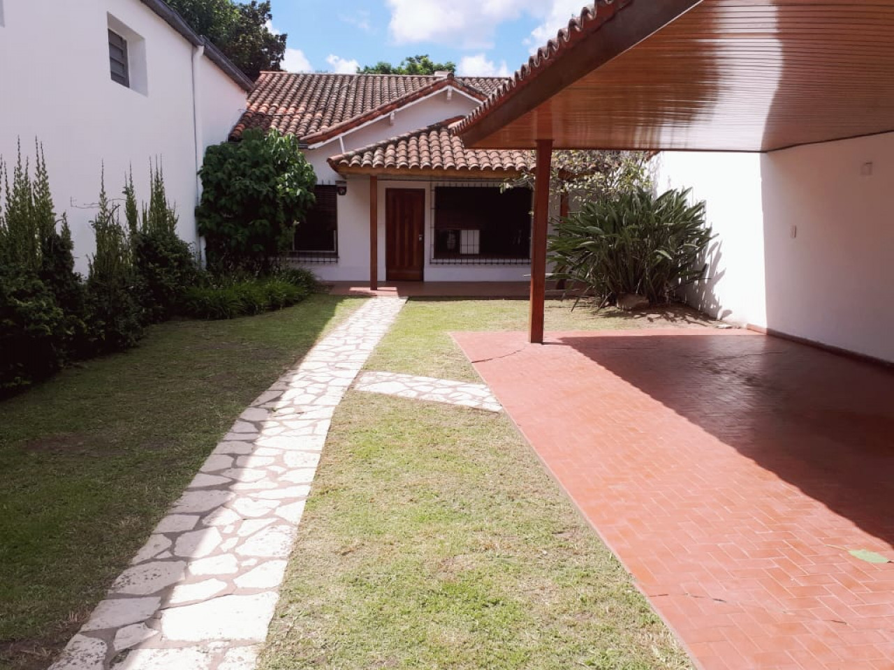 Ideal para emprendimiento habitacional: muy sólido, techo de teja colonial, jardín al frente, cochera con techo de tejas, abierta para varios autos, porche, hall de entrada, a ambos lados dormitorio con ventanas con rejas y persianas al frente, living amplio, un dormitorio grande, otro dormitorio con vista al lateral, baño completo, cocina comedor diario con mueble bajo mesada y alacena, termotanque, muy luminosa, salida a galería, jardín, parrilla.