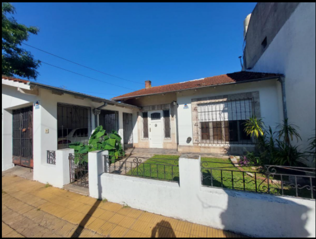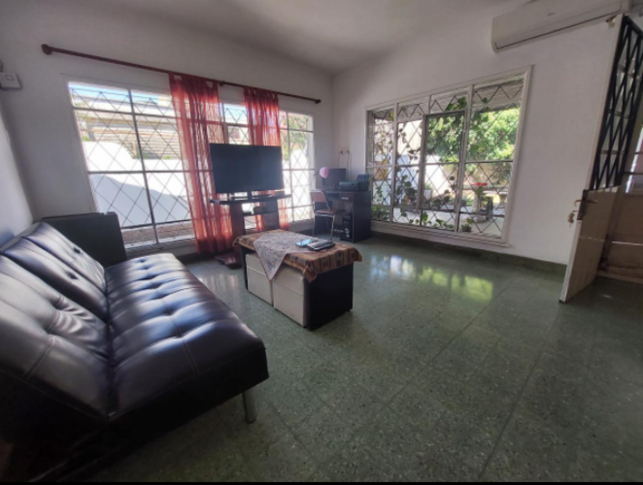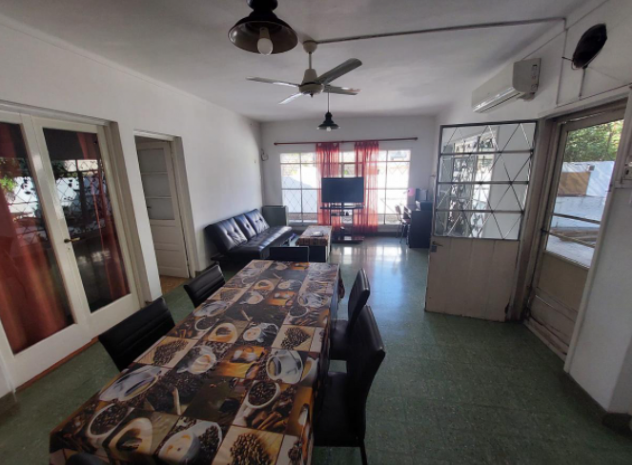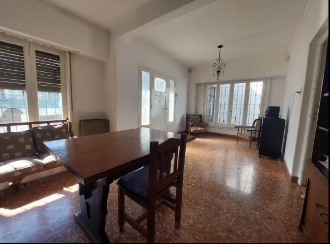 Chalet con tejas francesas, jardín al frente, garaje cochera pasante, living y comedor muy amplio y luminoso, calefactor, pasillo: Dos dormitorios, uno grande que se comunica al comedor diario, baño muy amplio con bañera y ventana. Cocina comedor diario de dimensiones importantes, con bajo mesada, termotanque, calefactor, aire tipo Split, muy luminosa. Puerta a estudio y/o cuarto de servicio. Exterior: gran patio, parrilla con mesada y pileta, cisterna para el agua corriente, jardín, lavadero y baño que se comunica con el estudio. Cuarto guarda útiles en el fondo. Escalera a terraza. Techo combinado con tejas francesas, losa y chapa. Construcción muy solida. Ambientes amplios.